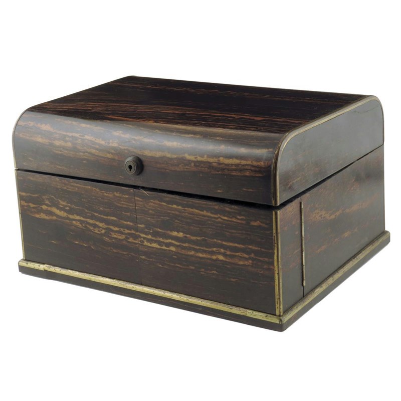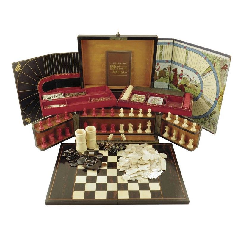 λA Victorian coromandel and brass mounted games compendium, the lid inset with an ivory and kingwood inlaid folding chequer and backgammon board, with a folding leather steeple chase board, above a lift-out tray fitted with draughts, a cribbage board, dominoes and playing cards, above a further tray with Bezique markers, bone spellicans, above a divided interior with a pair of ivory shakers, dice, agate and Chinese mother of pearl counters, with cold painted metal race horses and jockeys, with a twin hinged front fitted with a turned and carved ivory chess set, with a plaque inscribed 'THE ROYAL CABINET OF GAMES', with original guide pamphlet and with an associated steeple chase board, 20cm high, 36.8cm wide, 28.4cm deep.