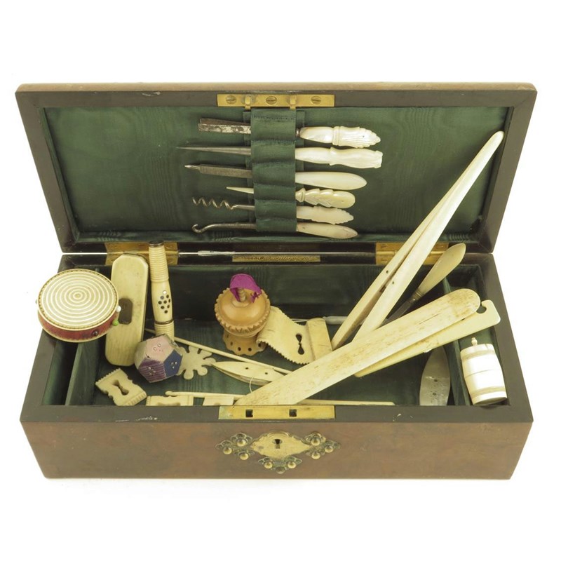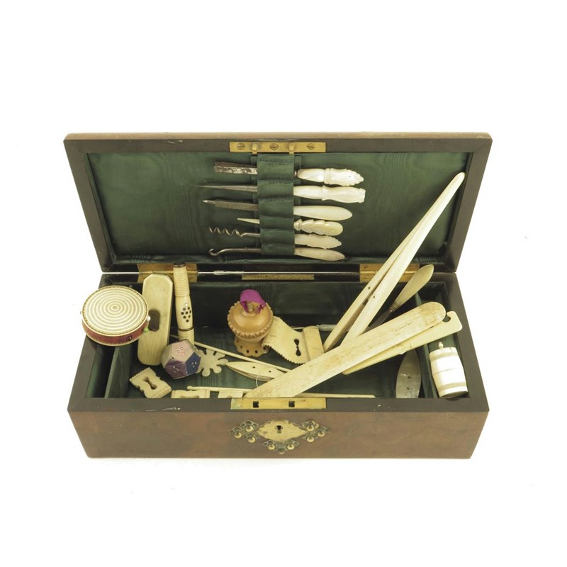 λA Victorian burr walnut and brass mounted work box by E. Baxter, the green silk lined interior containing an array of sewing utensils, including: an ivory glove stretcher, an ivory tooth pick box, a turned ivory pin cushion, bone and mother of pearl sewing shuttles, a vegetable ivory tape measure and mother of pearl handled implements with a brass makers plaque inscribed 'E. BAXTER, Maker, 16, Cockspur St. S.W', 8.7cm high, 26,8cm wide, 12.3cm deep.