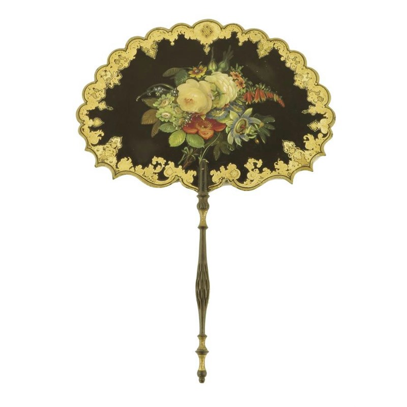 A Victorian papier-maché fan, painted with a floral spray within gilt borders, 39.7cm high, 28.5cm wide.