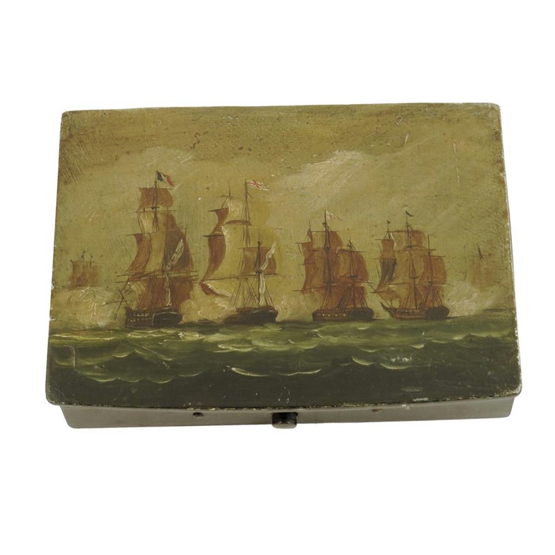 A 19th century papier-mache rectangular snuff box, the hinged lid painted with tall ships in battle, 13.8cm wide.