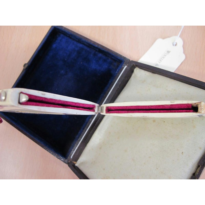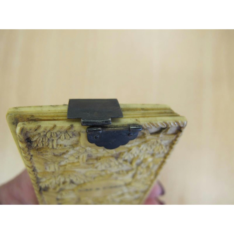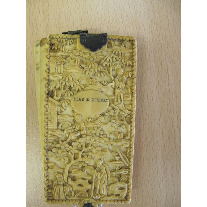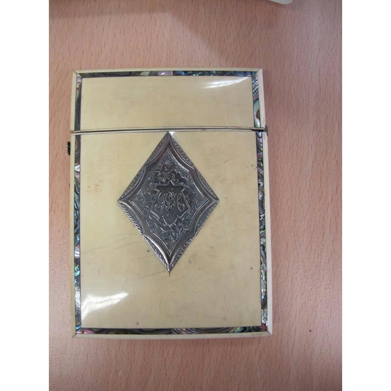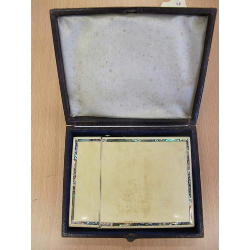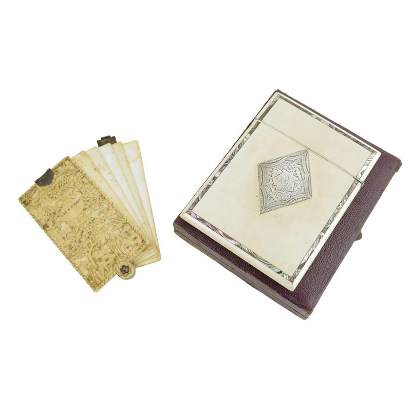 λA late 19th century Chinese Canton carved ivory aide-mémoire, 9.5cm long, together with a Victorian ivory card case, with abalone stringing and an engraved silver plaque with monogram, 10.5cm long, in a leather box. (3)
