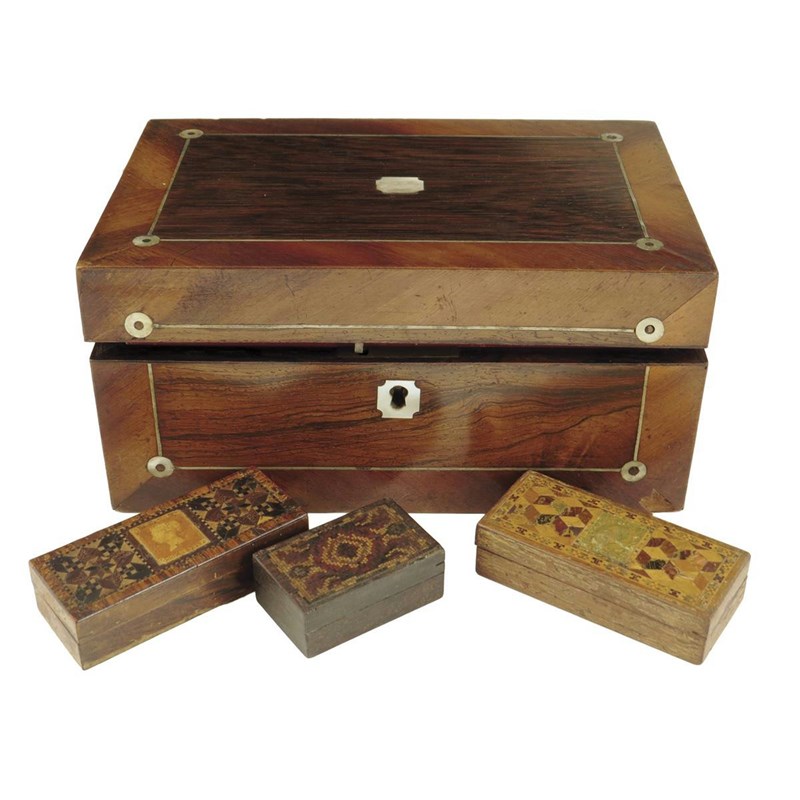 λAn early Victorian rosewood and mother of pearl jewellery box, 22.8cm wide, together with two Tunbridge ware stamp boxes and a similar box by Edmund Nye, stamped. (4)