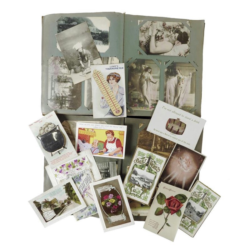 Two postcard albums, one inscribed 'Alice Maud Sosbe, March 30 1913, 1 Blythe Court, King Street, Blue Town, Sheerness', containing assorted postcards and photographs, including: topographical views of Ireland, Japan and China and some erotic examples. (2)
