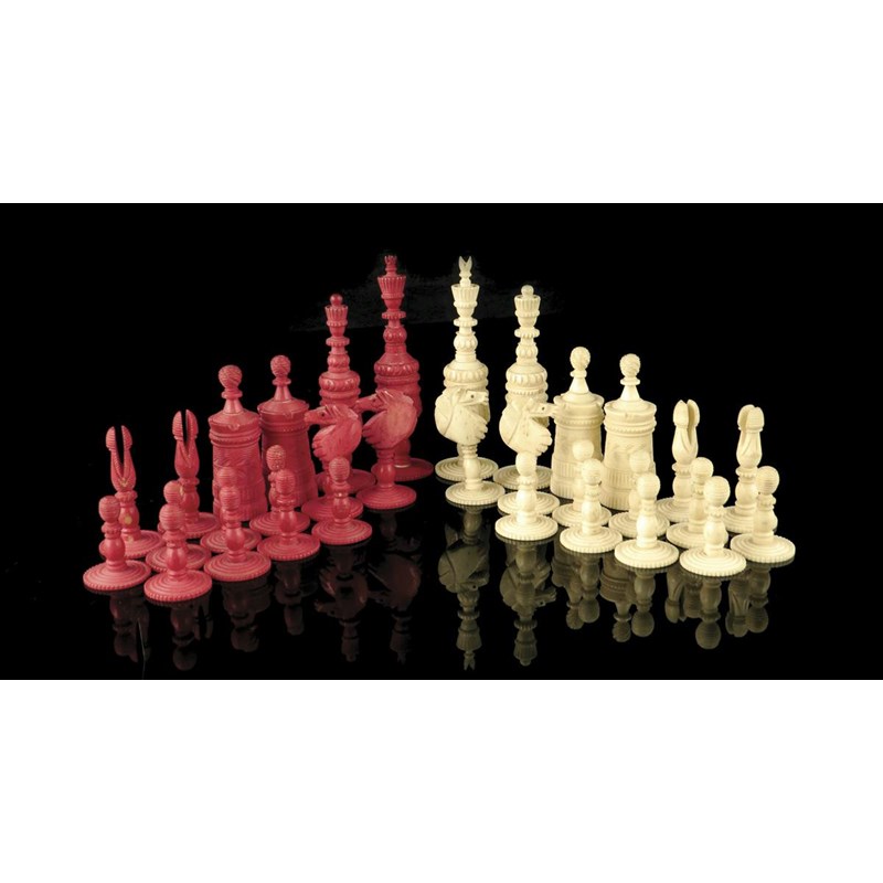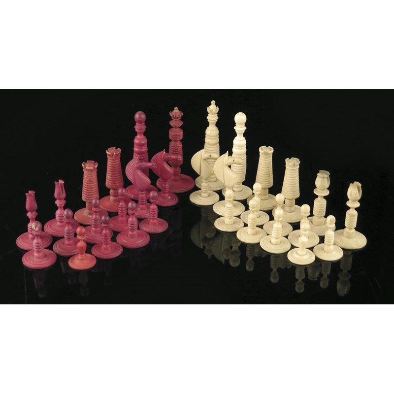 A 19th century turned bone chess set, natural and stained red, possibly Indian, king: 9.6cm high, pawn, 2.8cm high. together with a similar bone part chess set. (64)