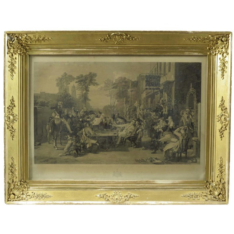 Five early 19th century engravings after David Wilkie R.A., 'THE READING OF A WILL', 'CHELSEA PENSIONERS READING THE GAZETTE OF THE BATTLE OF WATERLOO', 'DISTRAINING FOR RENT', 'THE BLIND FIDDLER', 'THE RENT DAY', engraved by J. Burnett and Abraham Rainbach, differing dates of publication, 1817- 1825, together with an engraving entitled, 'The Saints Day' after J. P. Knight A.R.A. each in a glazed gilt composition frame, 72.8 x 95.4cm. (6)