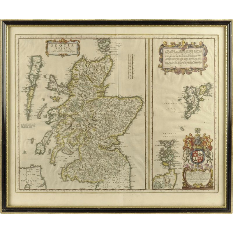 Johannes Blaue. (Dutch, 1598-1673). 'Scotia Regnum', a handcoloured engraved map of Scotland, c.1654, 47 x 57.2cm, in a later glazed Hogarth type frame.