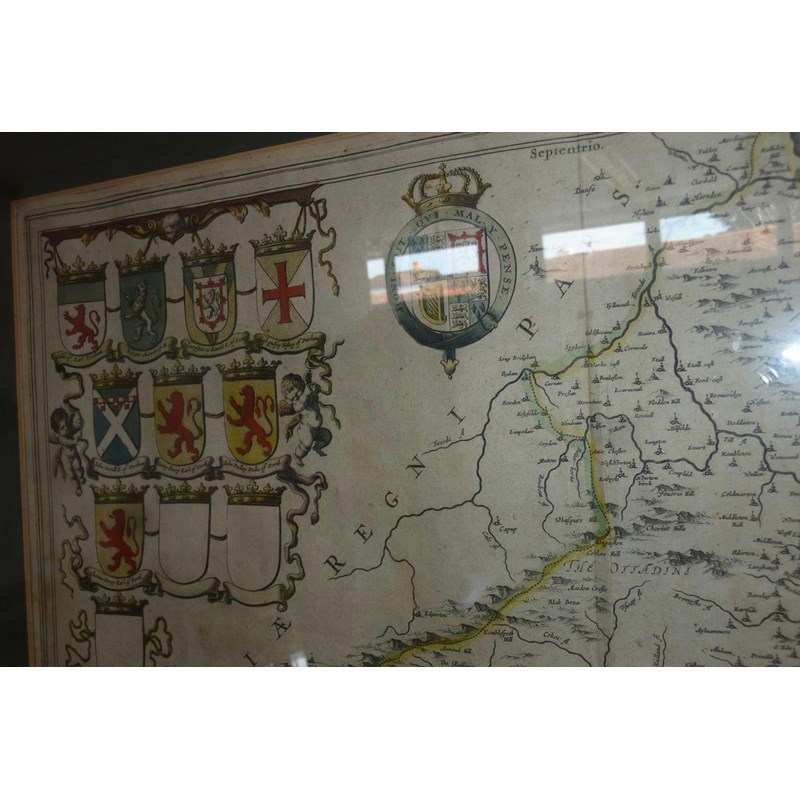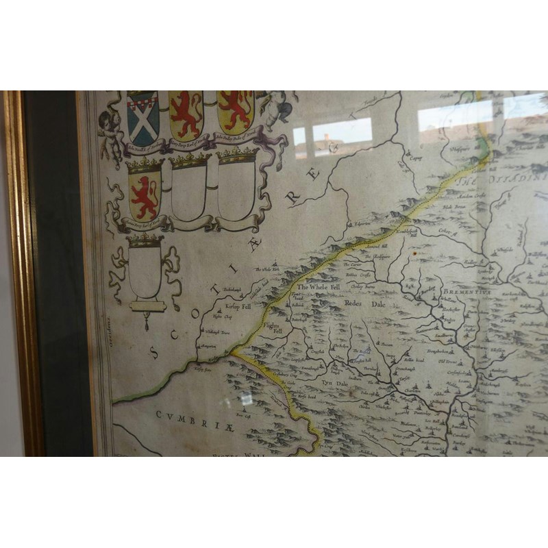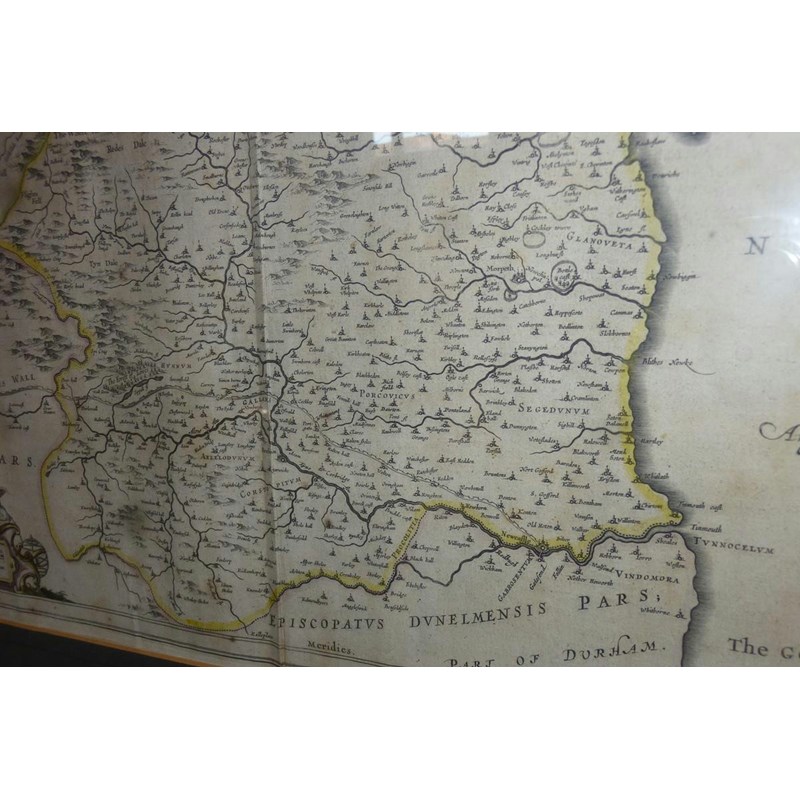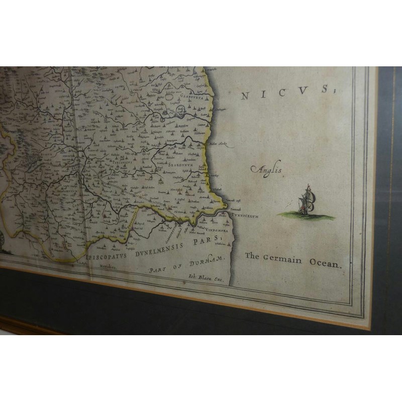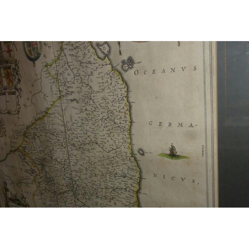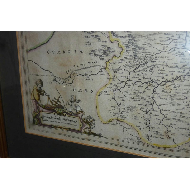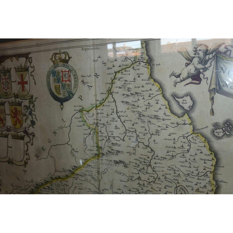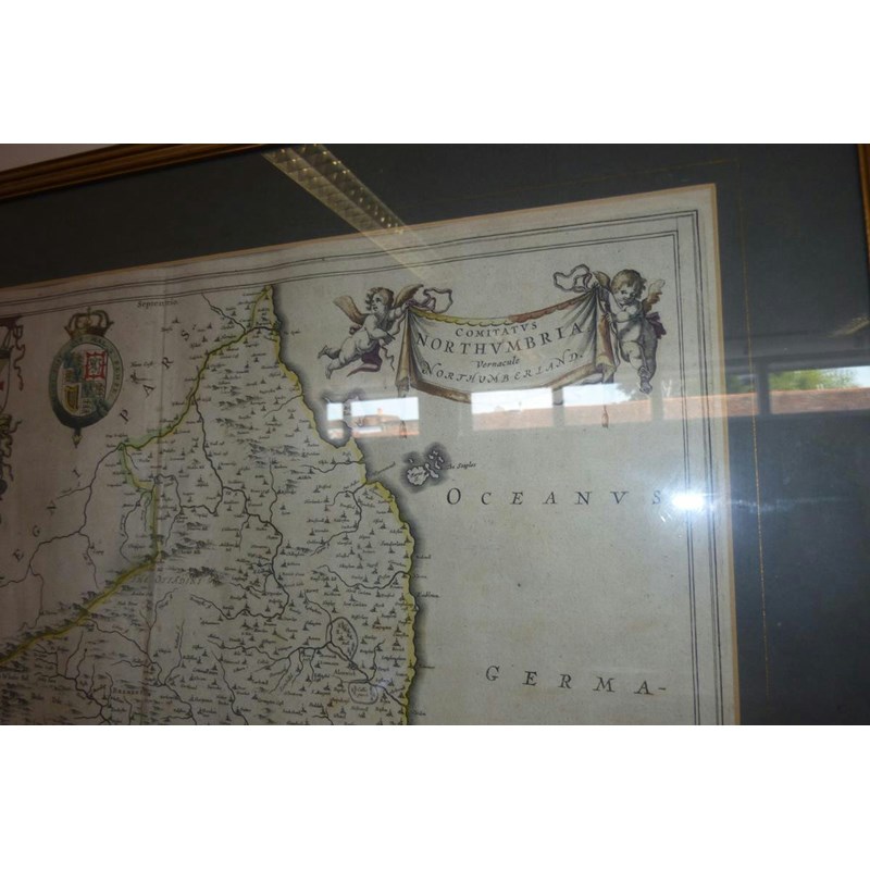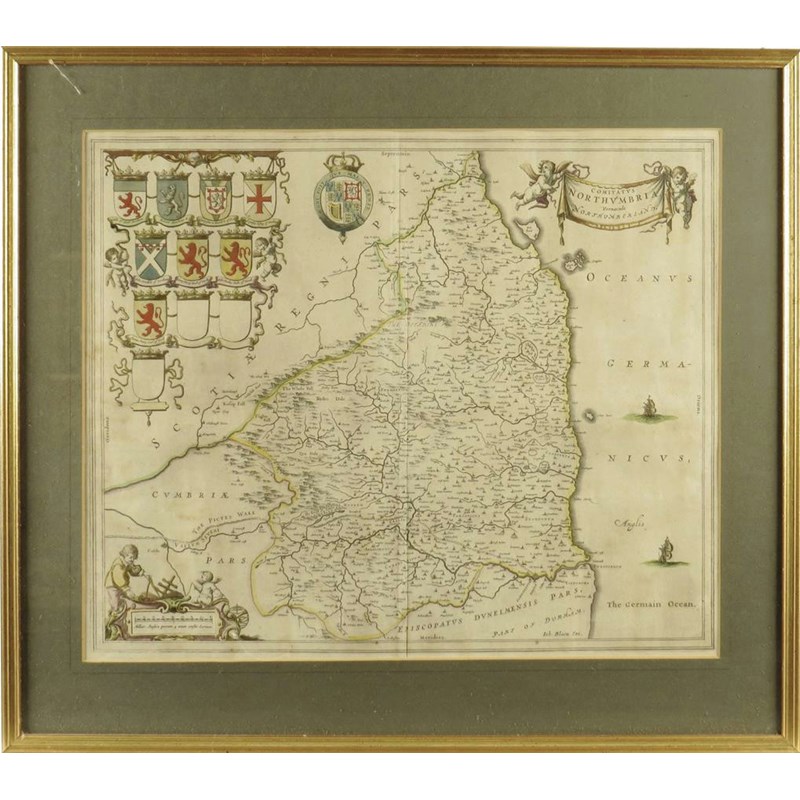 Johannes Blaeu. (Dutch, 1598-1673), 'COMITATUS NORTH UMBRIA, Vernacule, NORTHUMBERLAND', a hand coloured engraved map, circa 1645, 42 x 50.3cm, in a later glazed frame.