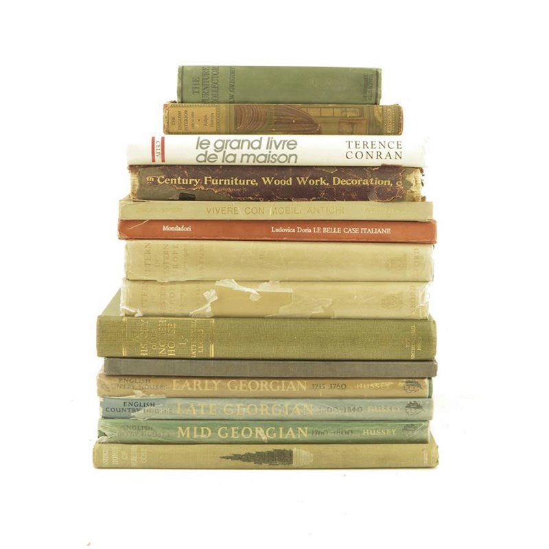 Literature: a small collection of books relating to antique furniture, interior design and architecture, including: Pattern, A Study of Ornament in Western Europe, 1180-1900, in two volumes, by Joan Evans; Mobili Antichi nella Casa di Oggi by Adriana Grippiolo; English Furniture, Woodwork, Decoration, Etc. During the 18th century by T. A. Strange, English Country Houses, in three volumes, by Christopher Hussey. (14)