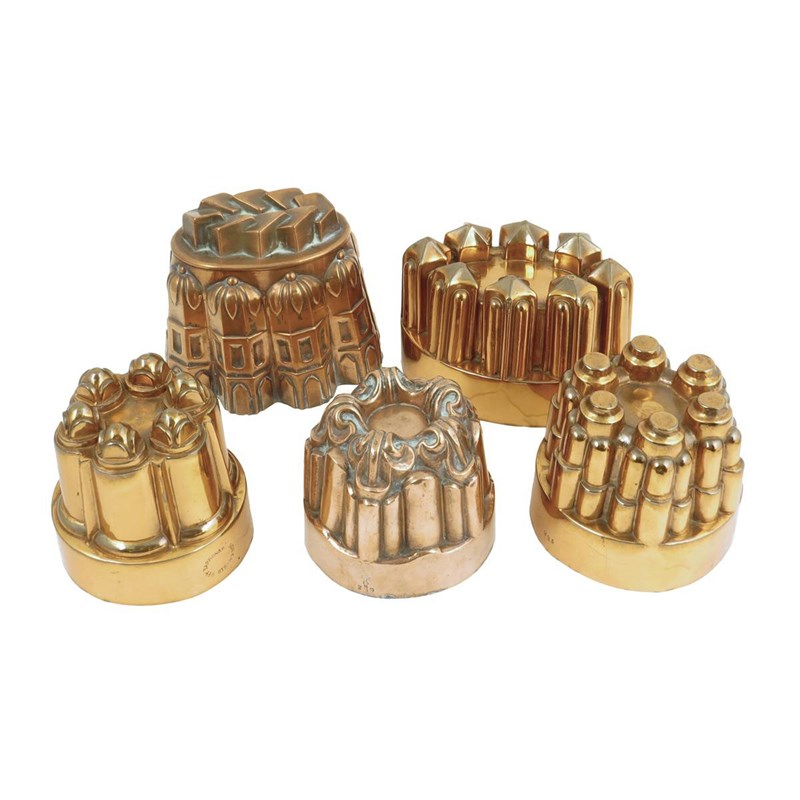 Five Victorian copper jelly moulds, two by Benham and Froud, one of which has a retailer's mark 'BARRON & WILSON 436 STRAND' and numbered '481' the other numbered '269', one marked with initials 'R H B' and numbered '15', one numbered '295' and one '21/2 3', 13.3cm high, max. (5)