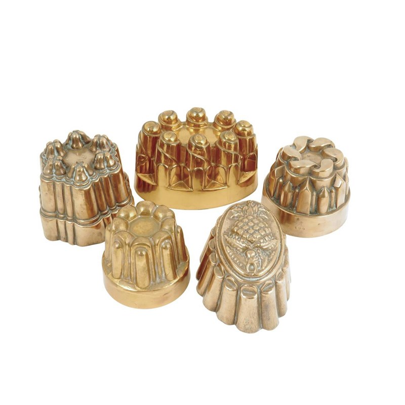 Five Victorian copper jelly moulds, four by Benham and Froud, one numbered '20', one '1A', one '439' with retailer's stamp ' EVANS & MATTHEWS, 79 & 80 BULL.., BIRMINGHAM' na one numbered '409', the other mould marked 'M404', 11.1cm high, max. (5)