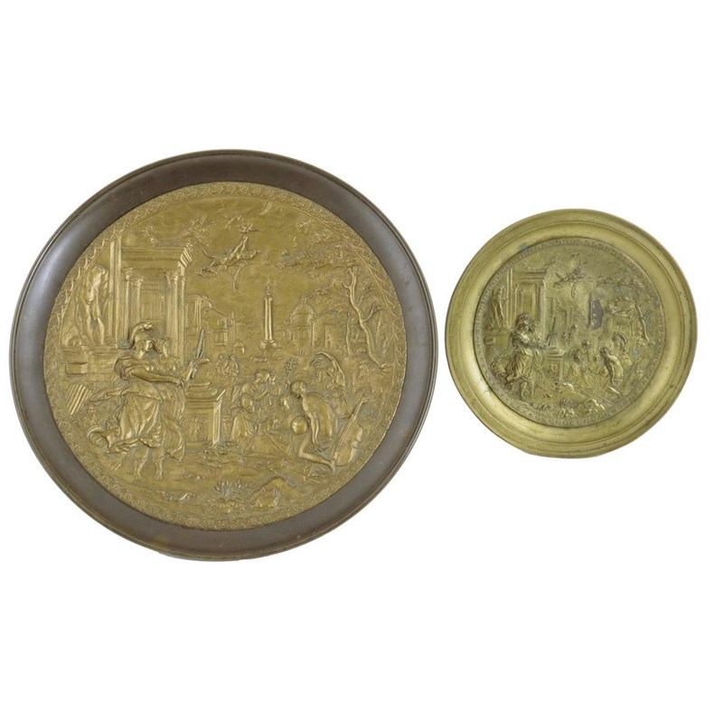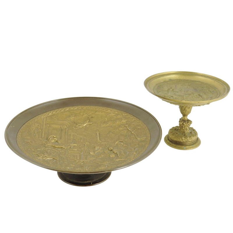 A late 19th century Italian gilt and patinated bronze tazza, decorated with a classical scene with Mercury and various other figures, 11cm high, 31cm diameter, together with a smaller tazza cast with the same scene. (2)