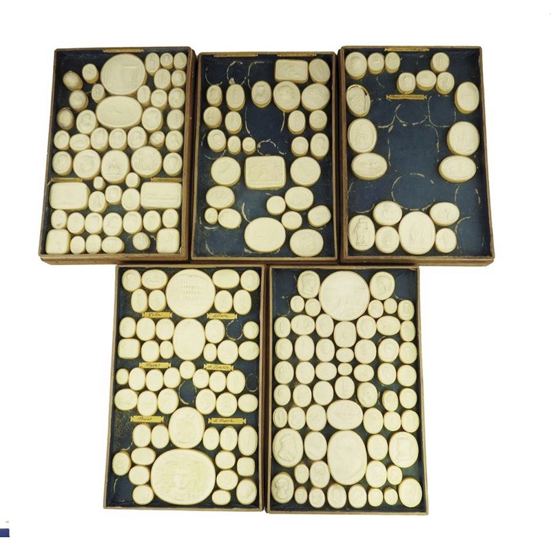 A collection of 19th century Italian Grand Tour plaster intaglios, in a plane wood box with five titled trays 'Museo Capitolino', 'Museo Vaticano', 'Villa Albani', 'Museo Di Parigi', 'Opere de Canova', 'Thorwaldsen', 13.2cm high, 32.5cm wide, 20.8cm deep.
