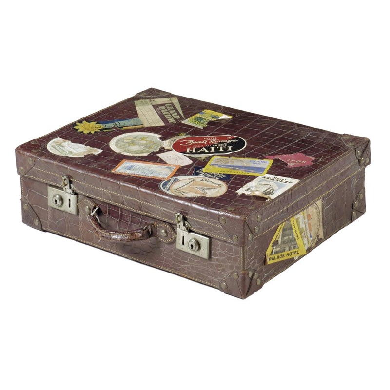 A crocodile leather suitcase, applied with various hotel labels, the interior originally fitted, early to mid 20th century, 17.7cm high, 57cm wide, 44.5cm deep.