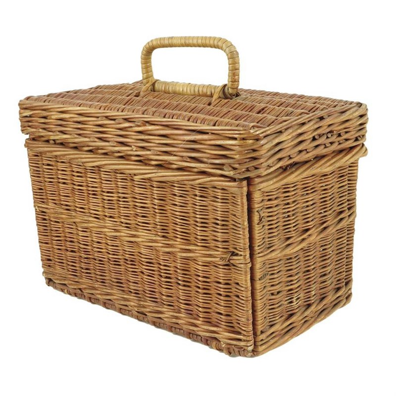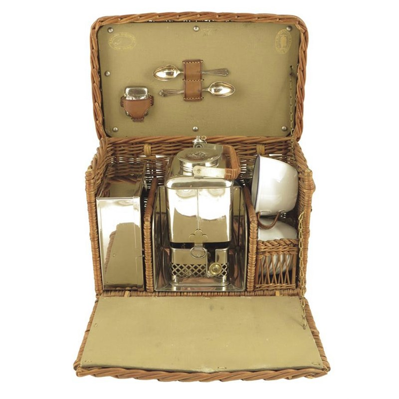 A wicker tea for two picnic basket, the interior fitted with a kettle and burner, a metal box, cups, plates and other utensils, 26.7cm high, 30.3cm wide, 19cm deep.