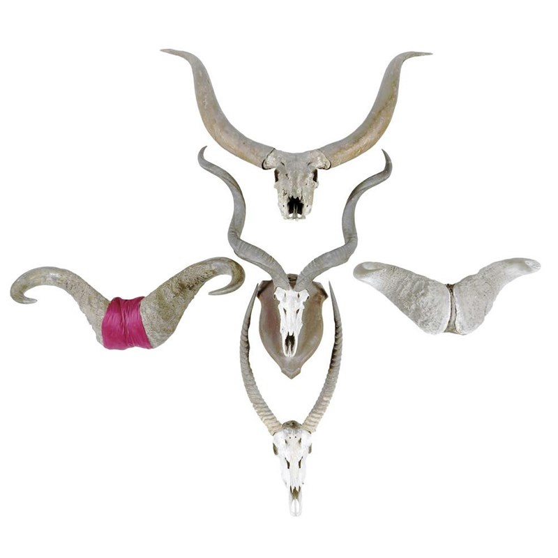 A pair of Indian water buffalo horns (Bubalus bubalus bubalus), on upper skull, 150.8cm wide, two pairs of water buffalo horns, a pair of Thomson's gazelle horns and a pair of kudu horns, with skull, mounted on a shield. (5)