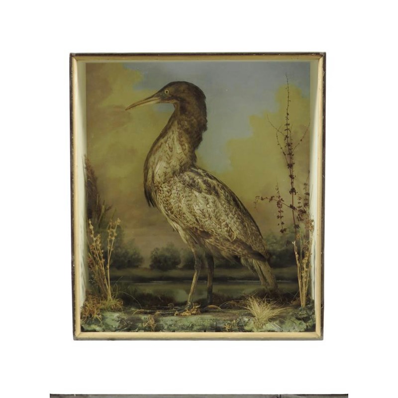 A taxidermied bittern, in a naturalistic setting with a painted river landscape backdrop, in an ebonized and glazed case, 61cm high, 53.5cm wide, 19.5cm deep.