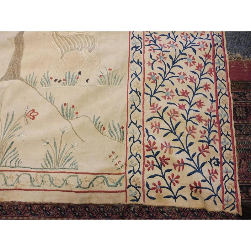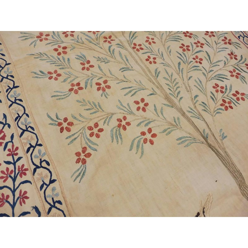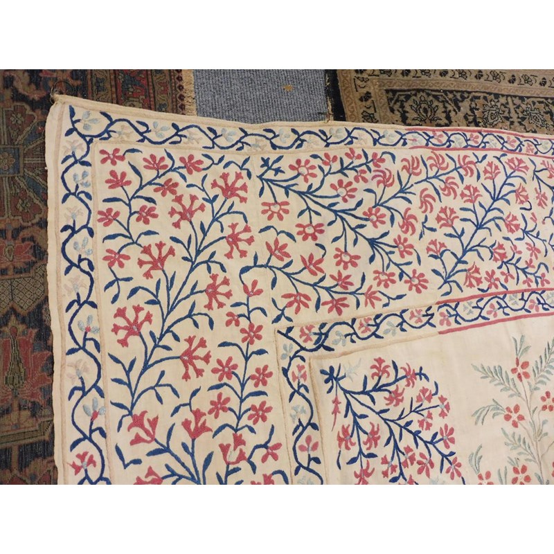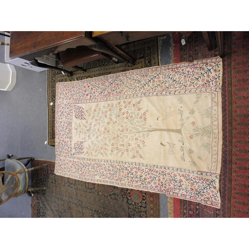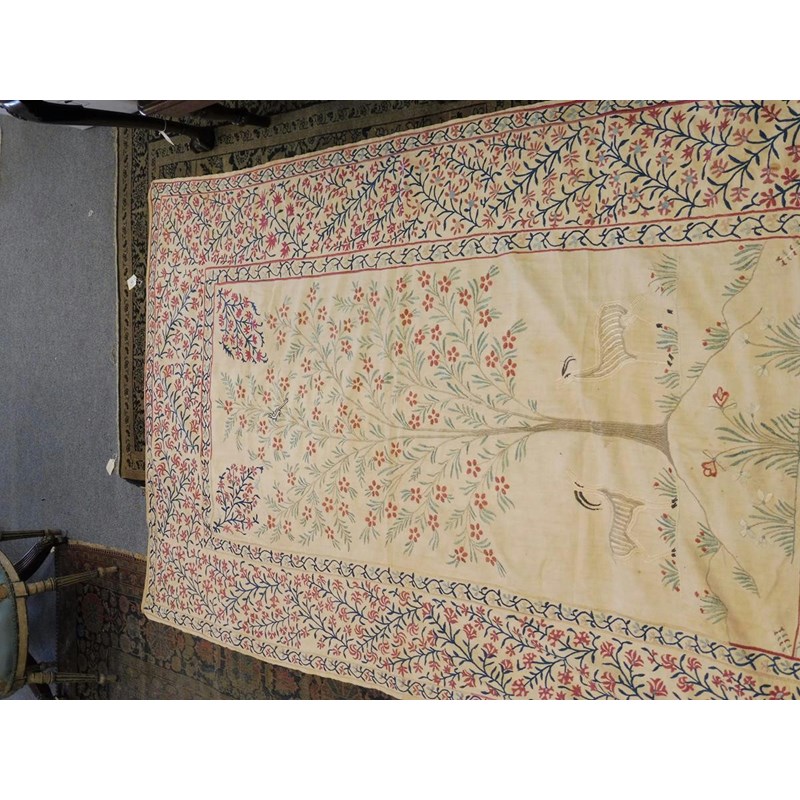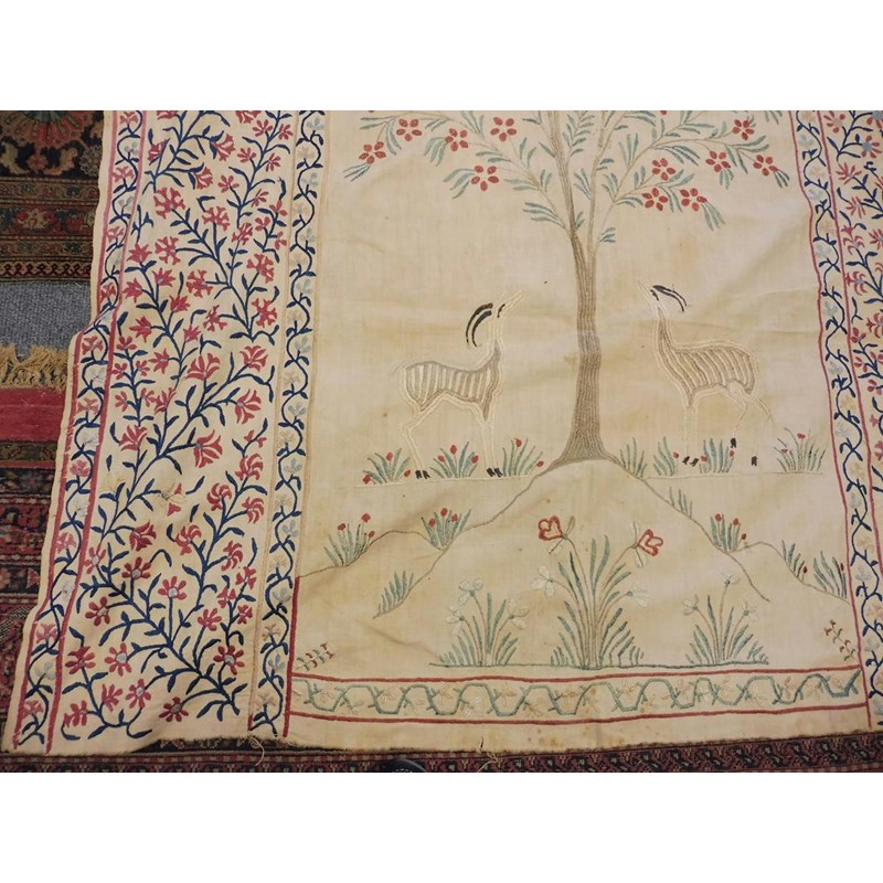 A Suzani embroidered hanging, worked with coloured silks, decorated with a tree with two rams with scrolling foliage borders, early 20th century, 223.5 x 136.5cm.