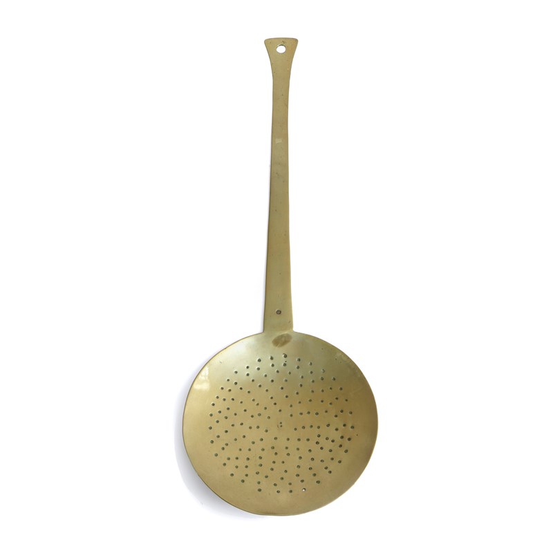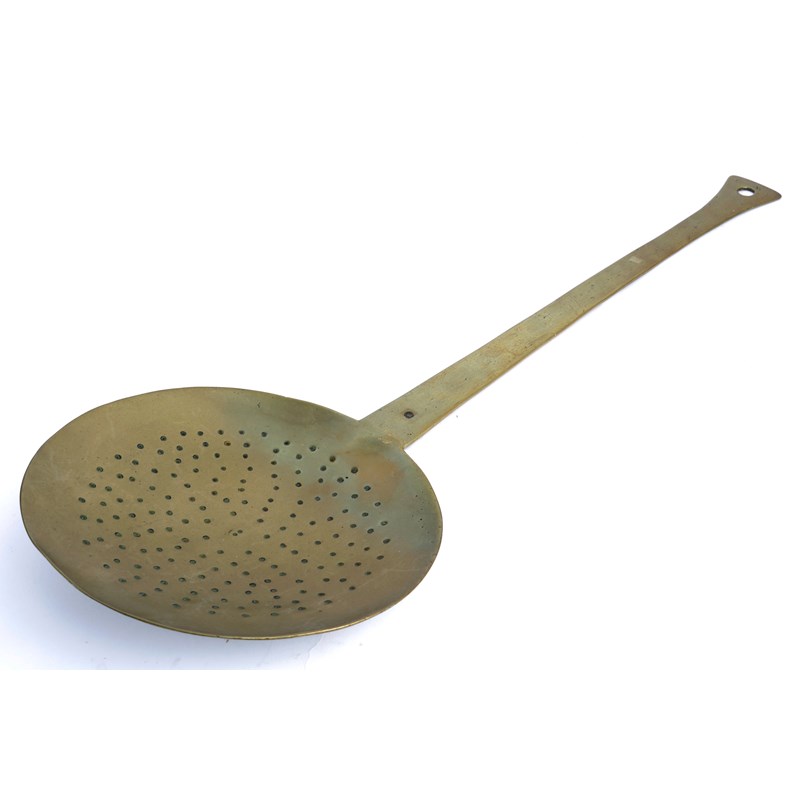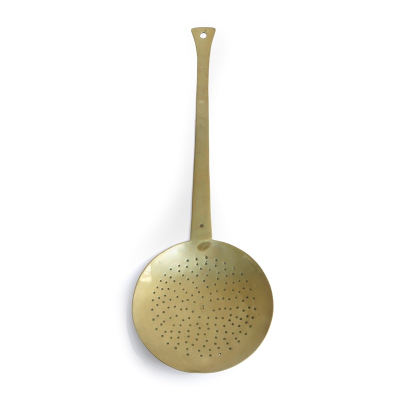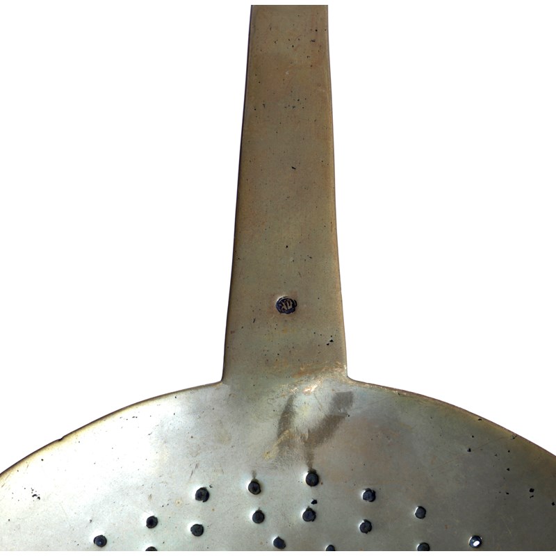 cast as one, the near-flat pan with radiating pierced holes, the handle with a punched maker's mark