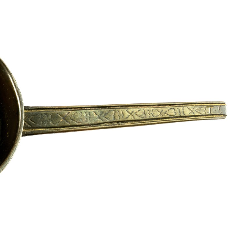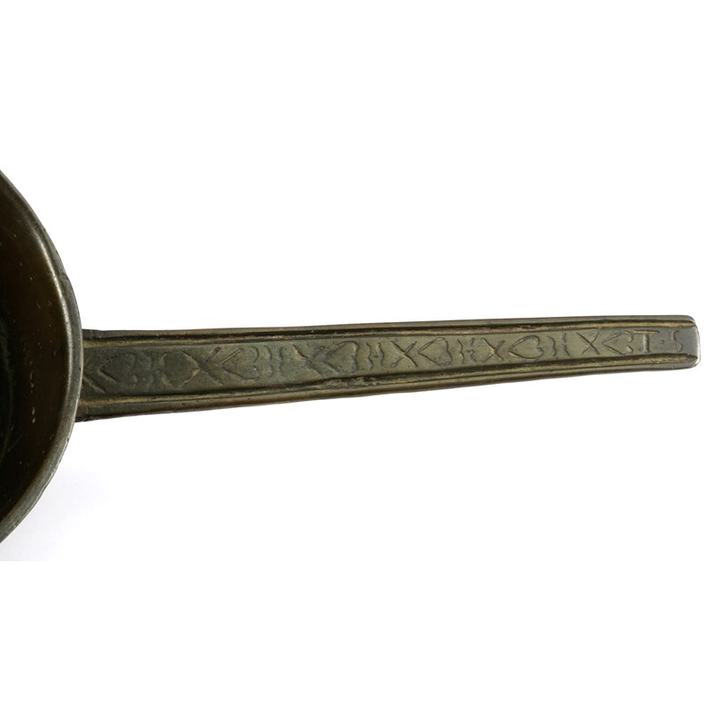 loam cast, the bowl with slight rim, four-arc and stylised 'T' founder's marks, on short ribbed leg, the handle with a rare cast design of hearts and crosses, the end with maker's initials 'T.S'