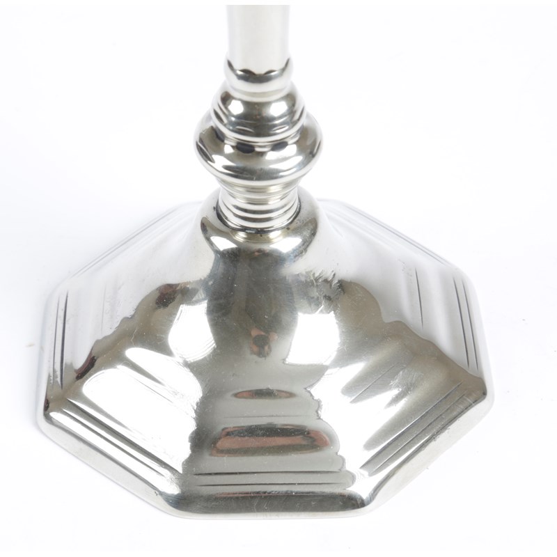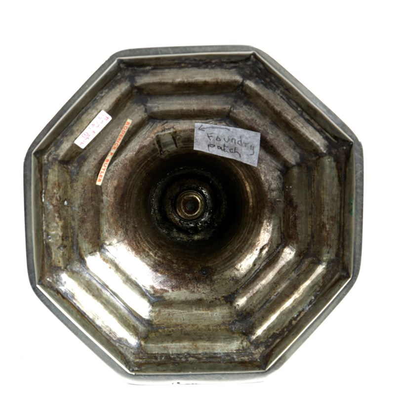 cast in two parts and threaded together, with a rising-baluster stem above a ball knop and faceted socket, on a raised octagonal base, a clear foundry patch to underside