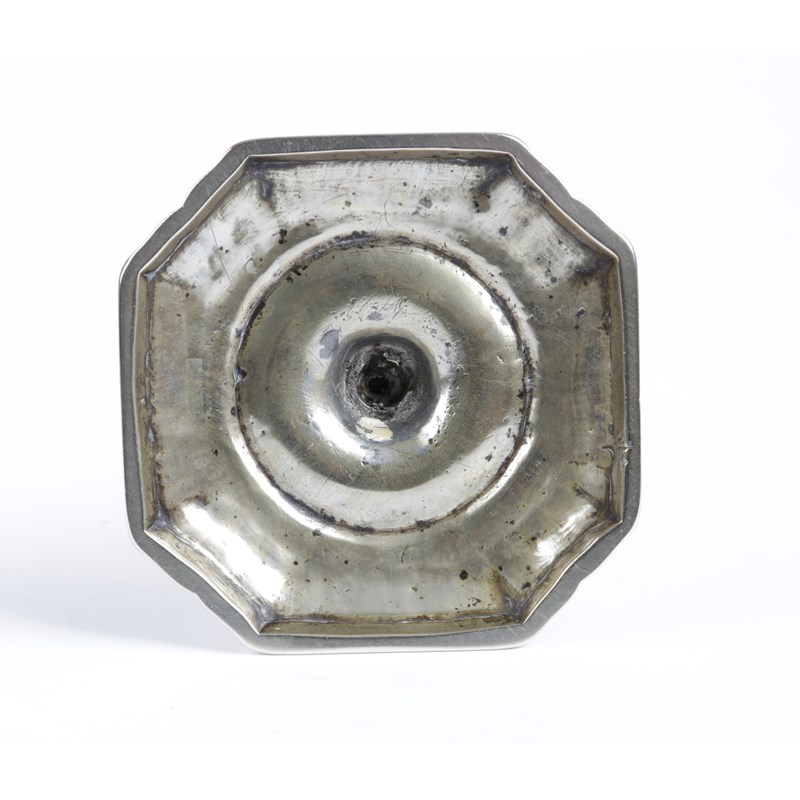 the stem cast with a rising-baluster above a ball knop, on a 'cut-corner' square base, the 'cut' sections with ogee-arched edges and unusual decoration