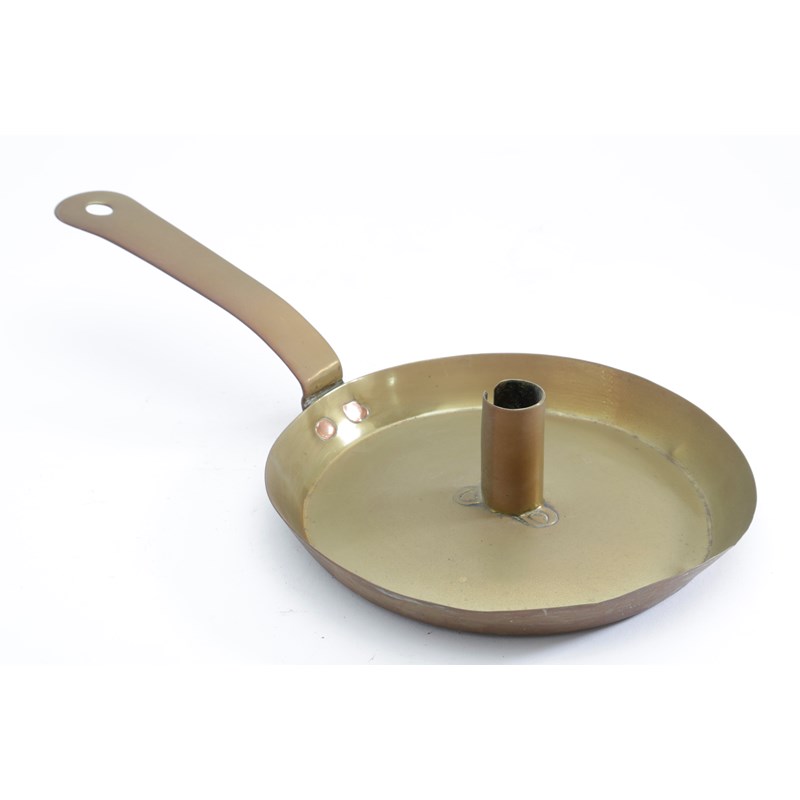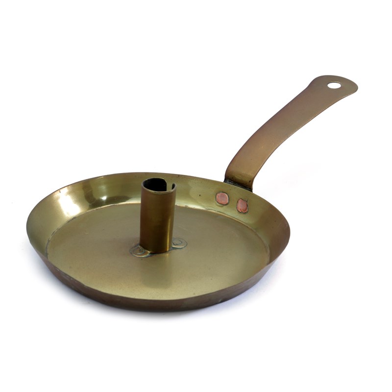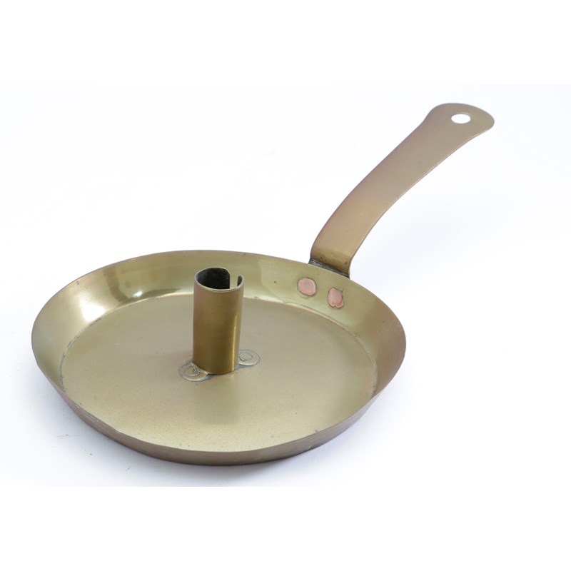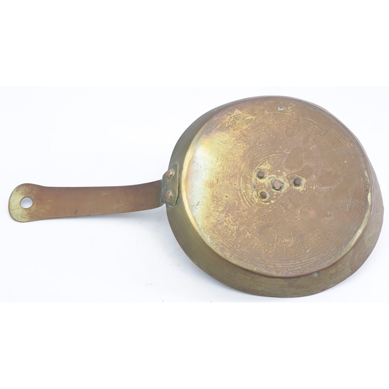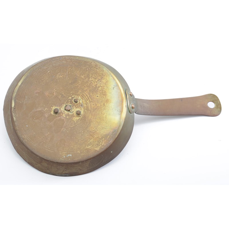 having a large 'frying-pan' centred by an open socket with rivetted tabs, the handle with rounded and pierced terminal