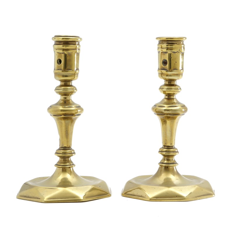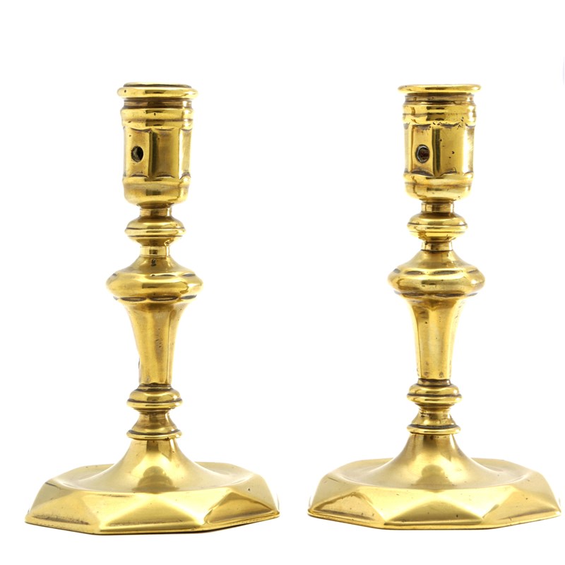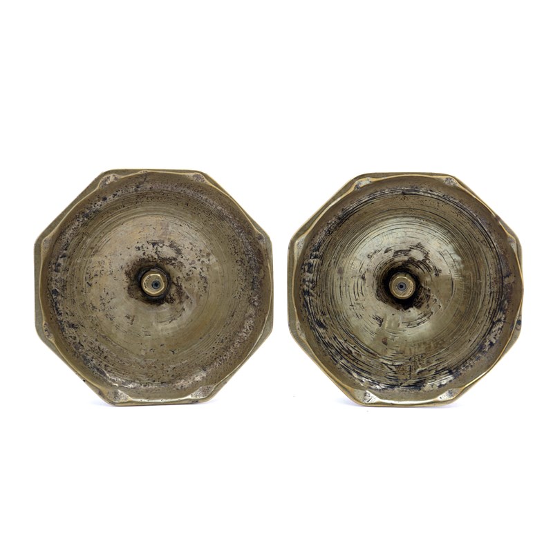 each with an octagonal socket with a circular extraction hole, inverted baluster stem and dished, faceted base (2)