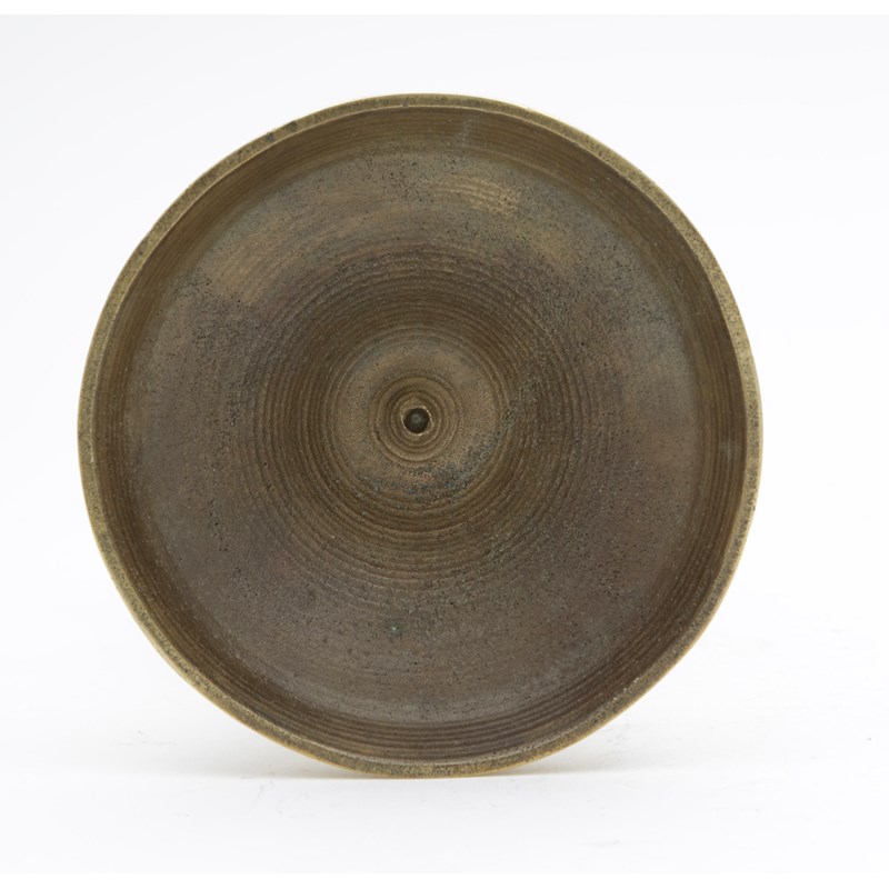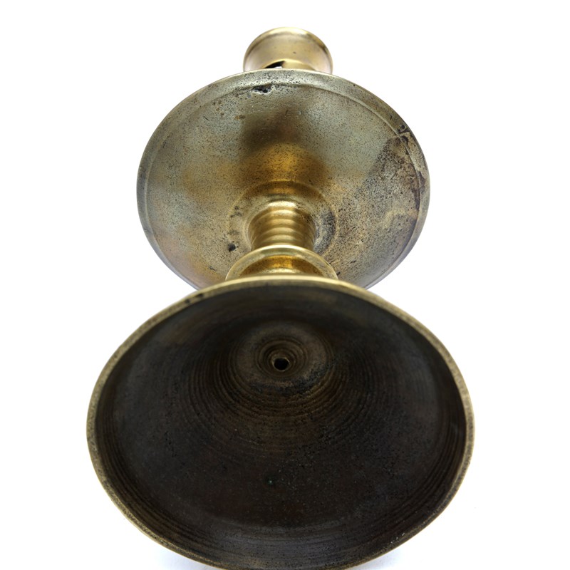 two part casting, peaned then turned, having a bold slightly flared socket with a pair of rectangular extraction holes, on a single discoid knop stem above a broad and deeply dished drip-pan, a ribbed base with discoid knop and spreading circular ribbed base, the lead weight to the underside removed