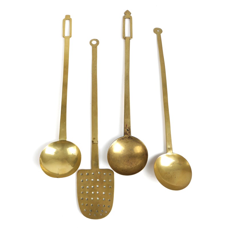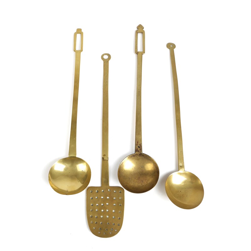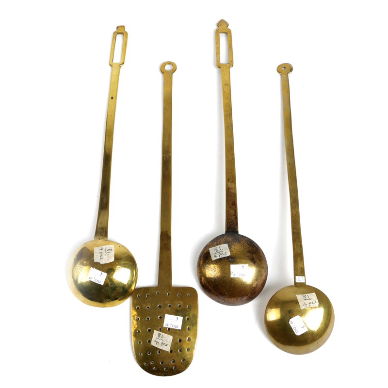 FOUR 17TH / 18TH CENTURY BRASS DOMESTIC UTENSILS
