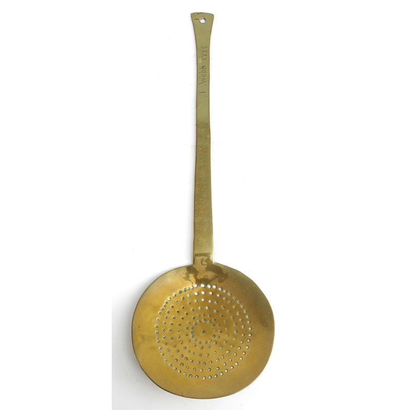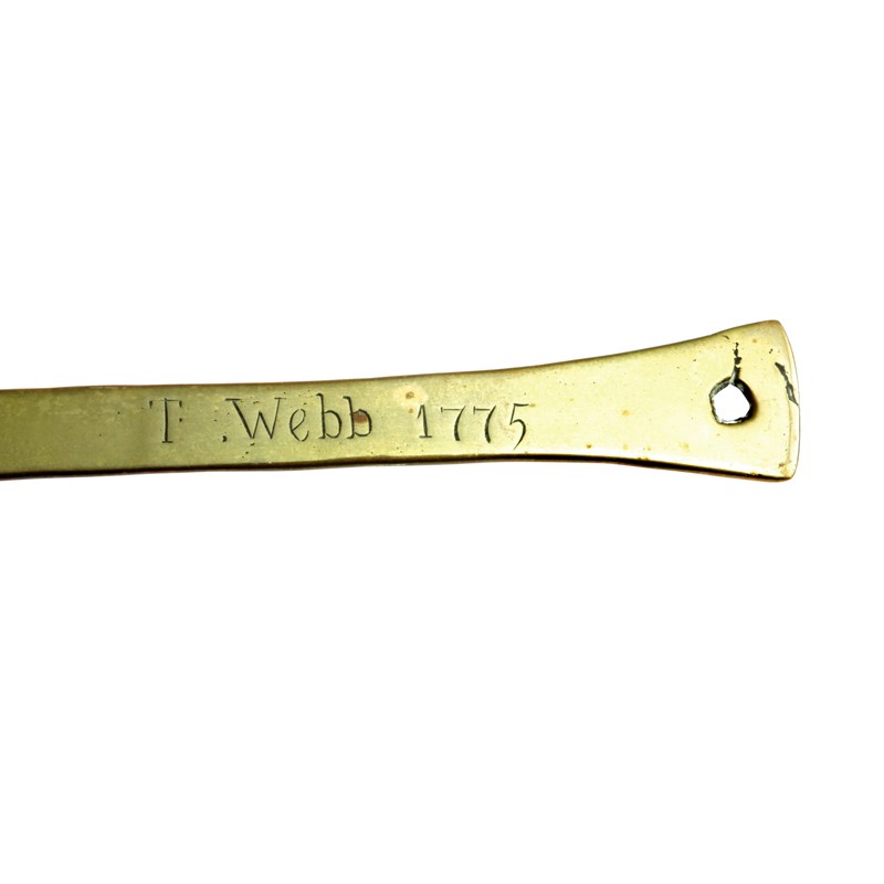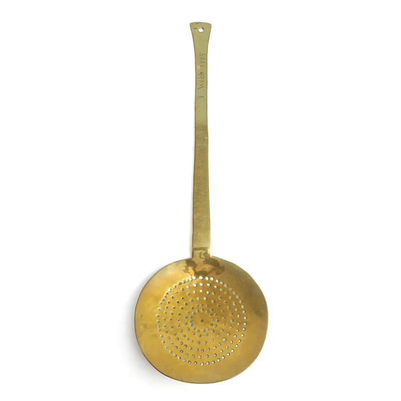 with six concentric bands of piercing to the pan, cast as one, the tapering handle inscribed to the front 'T. WEBB 1775'