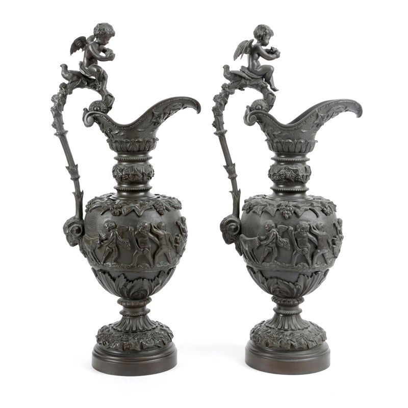 A LARGE PAIR OF BRONZE ORNAMENTAL EWERS IN RENAISSANCE STYLE