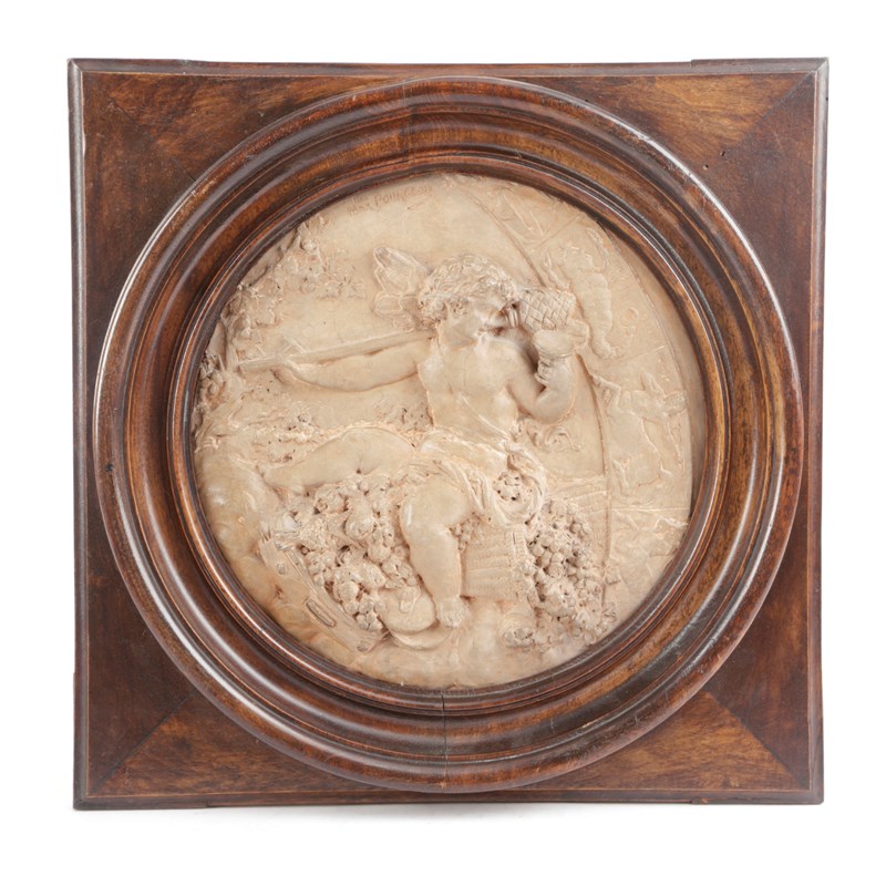 each relief moulded depicting a cherub with seasonal plants, symbols and star signs, inscribed 'MAX BOURGEOIS', in walnut frames (4)