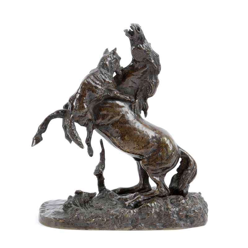 A FRENCH BRONZE ANIMALIER GROUP OF A WOLF ATTACKING A STALLION