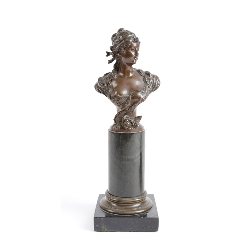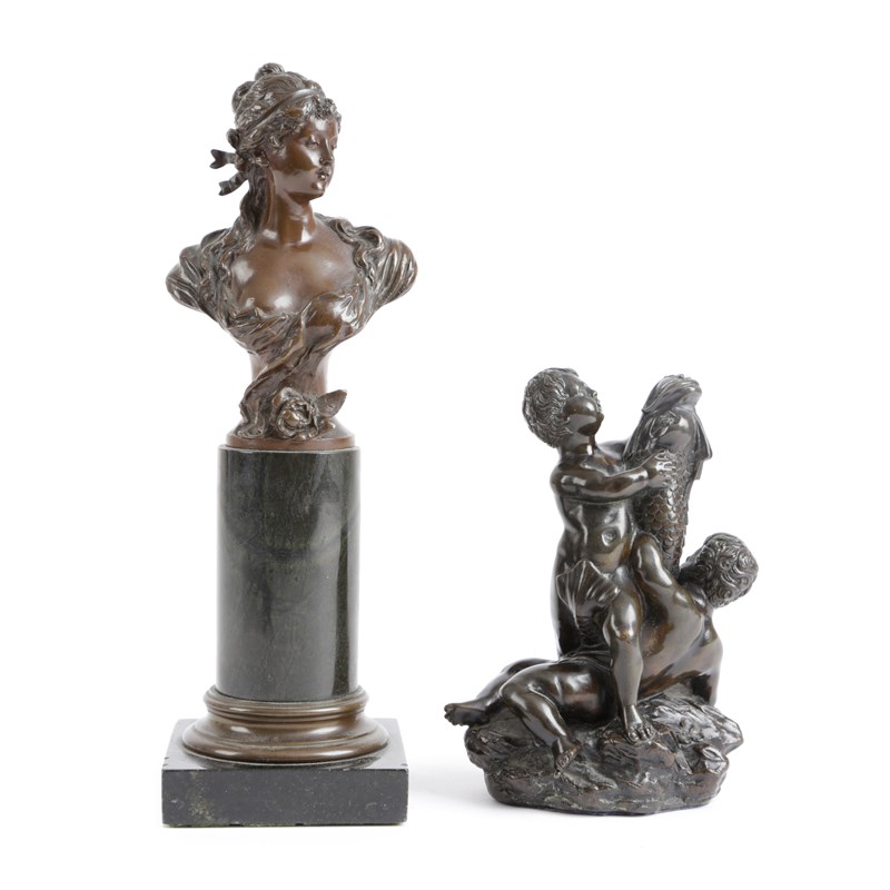 cast wrestling a dolphin, together with a bust of a maiden inscribed 'E. Bonnel Berlin', on a marble plinth (2)