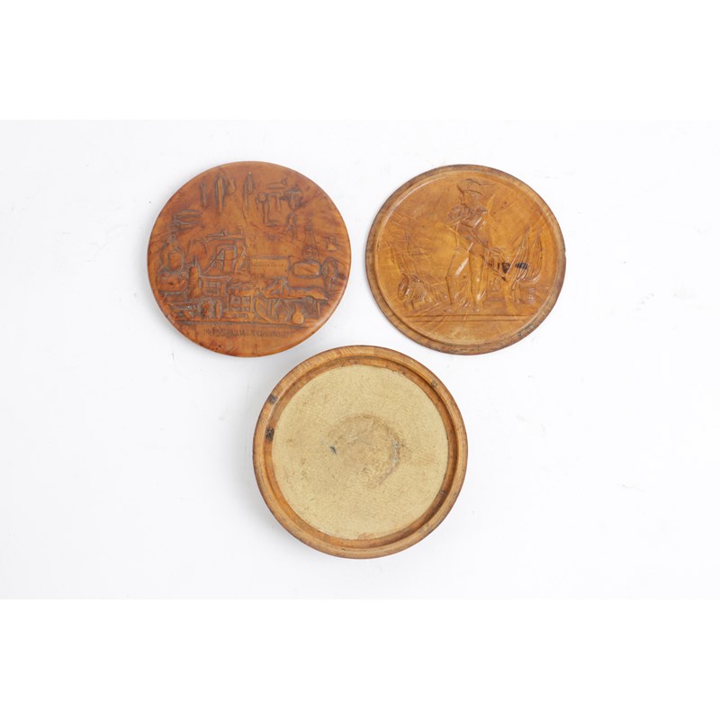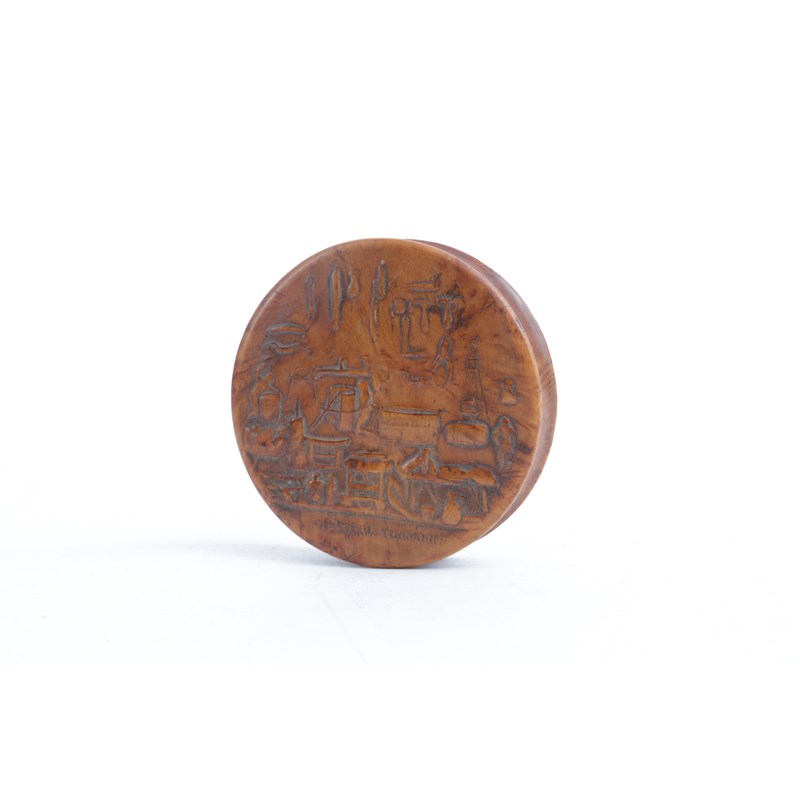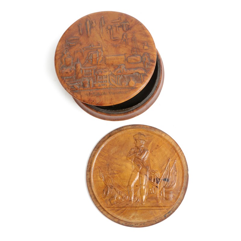 the lid decorated with men at work and various utensils, with an indistinct inscription, the base with a secret screw-off cover revealing a portrait of Napoleon