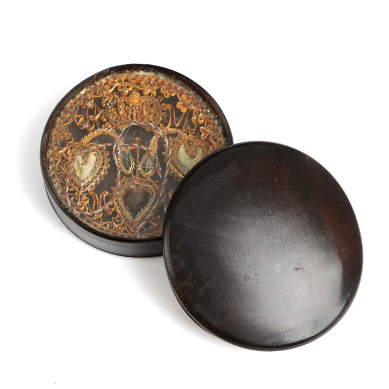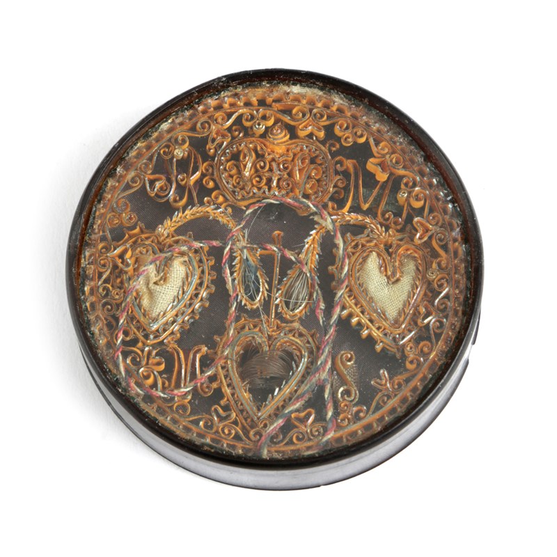 with a fine scrolled, cut and gilt edged paper design of three hearts, two with linen centres and one with a hair sample together with two further hair samples, mounted beneath a crown and inside a scrolling border, intertwined with a red, white and blue cotton thread, the corners with the initials 'R, M, M, S' the underside of the cover inscribed in ink 'Blood & Hair of King James 2d. Blood & Hair of the Queen and Hair of ye Princes'