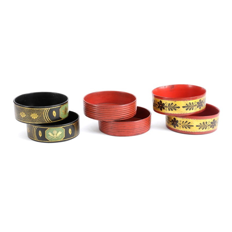 including: a red lacquer pair with ribbed decoration and an ebonised pair gilt decorated with bees (6)