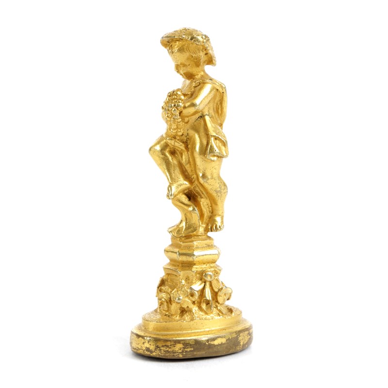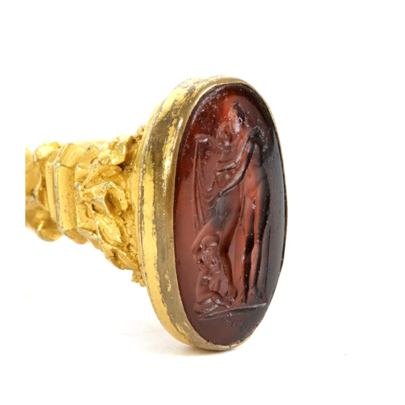 cast as a Bacchanalian cherub holding a bunch of grapes, set with a carnelian intaglio depicting a pair of embracing figures
