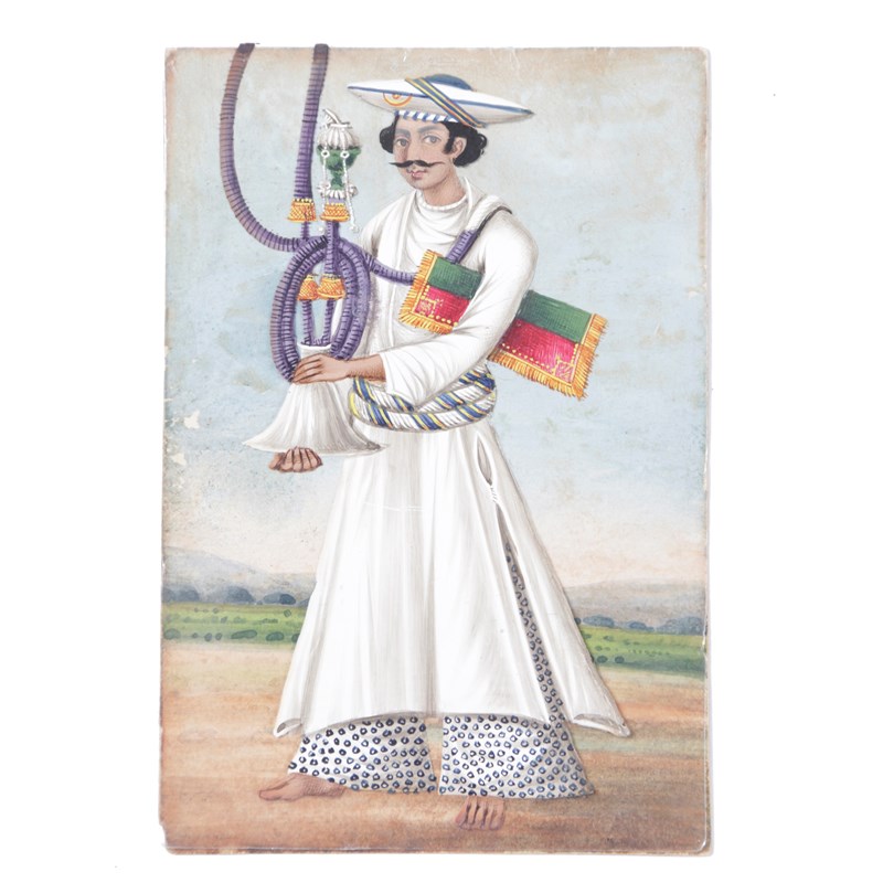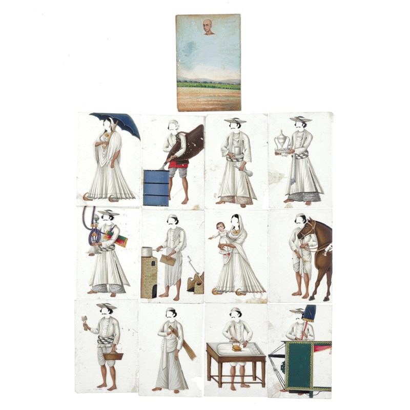 gouache on mica, with a set of twelve faceless portraits of male and female characters and a gouache on card 'floating' head on a rural landscape (13)