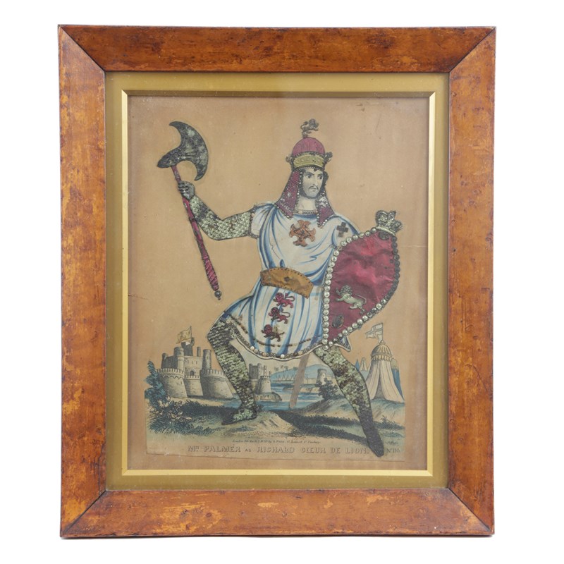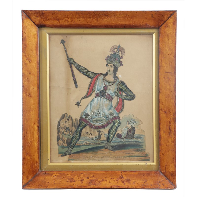 'Mr Palmer as Richard Couer de Lion' and 'Mr G. Almar as Coral Crown the Water King', both published by A. Park, hand-coloured engravings with cut tinfoil and sequins each in a glazed bird's eye maple frame (2)