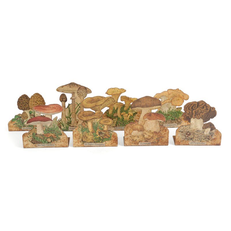 A SET OF EIGHT GERMAN TOLE MUSHROOM TEACHING AID BOOKENDS