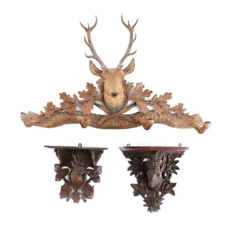 with a central deer's head amongst oak leaves and with four hoof hooks, inscribed '2 nbre 1910 Geneveive Suisse', together with two Black Forest wall brackets with a deer and a goat's head (3)