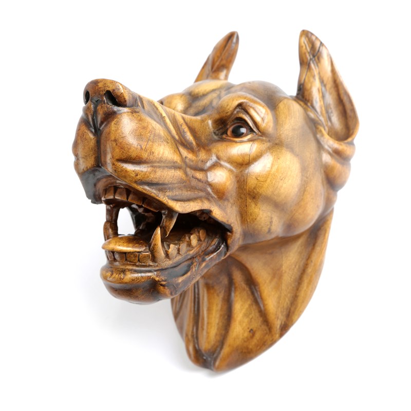 probably a doberman, carved with pointed ears, with glass eyes