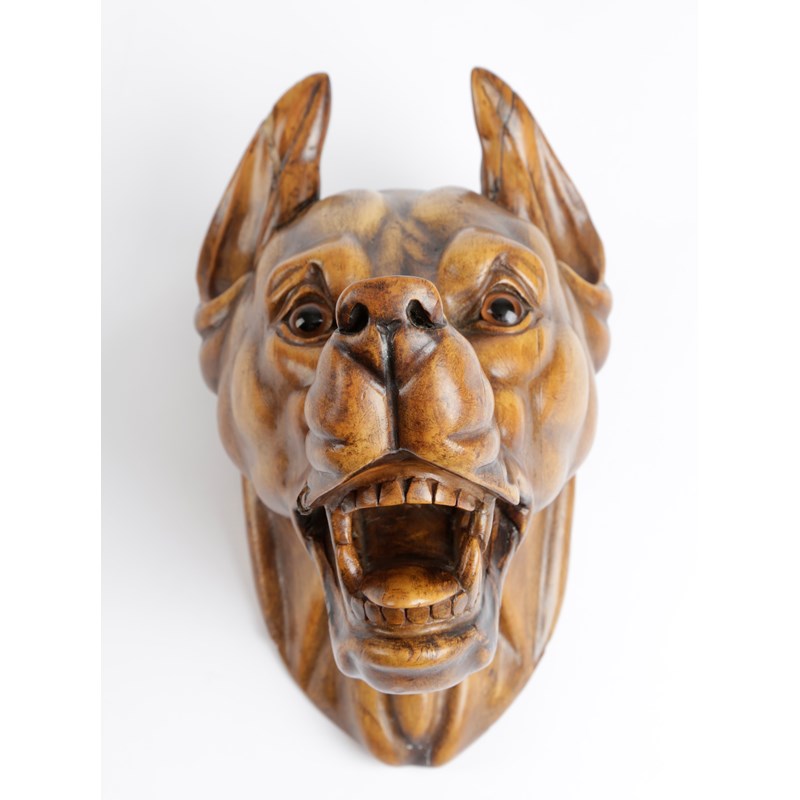A BLACK FOREST LINDEN WOOD HEAD OF A DOG