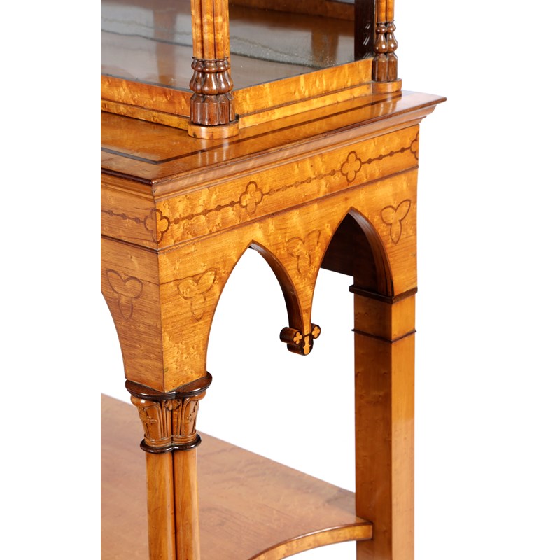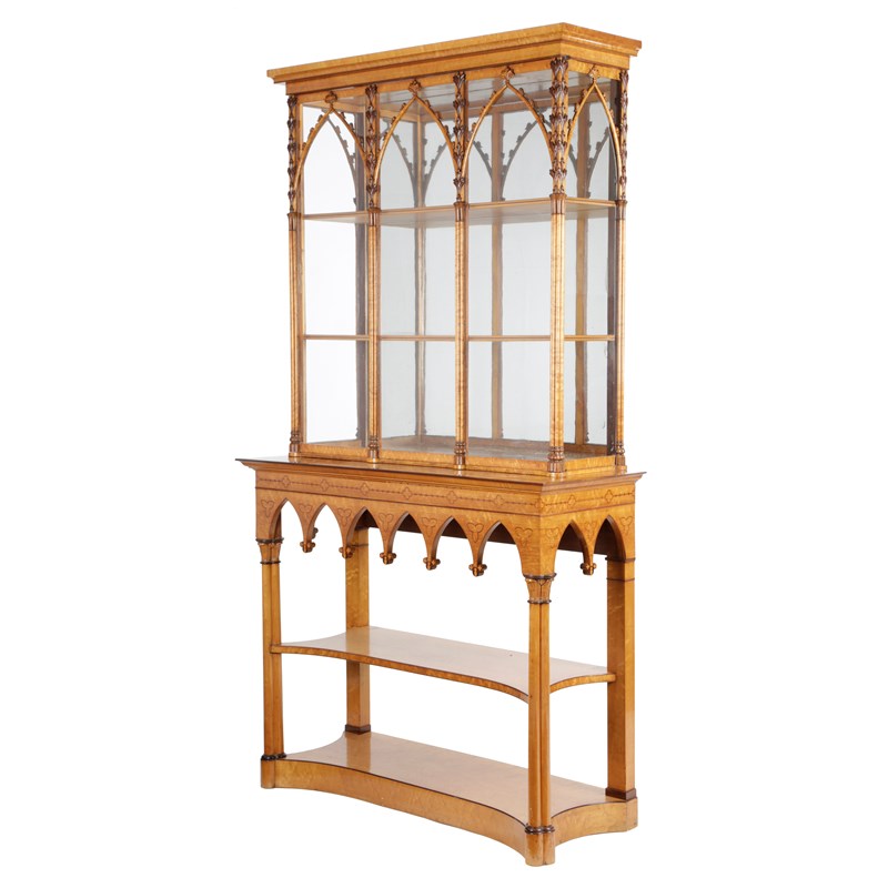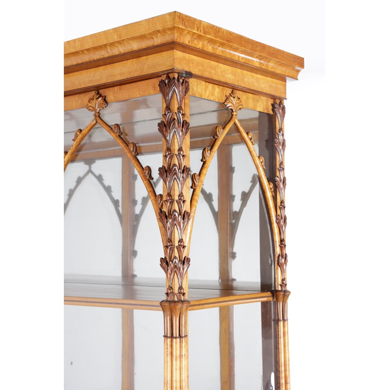 A WILLIAM IV GOTHIC REVIVAL BIRD'S EYE MAPLE AND PURPLEHEART DISPLAY CABINET