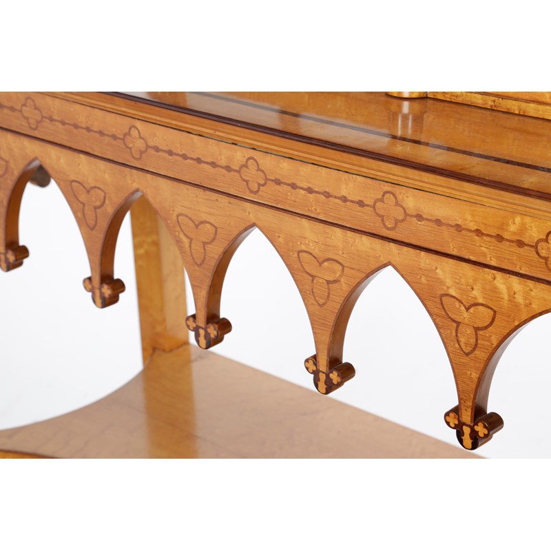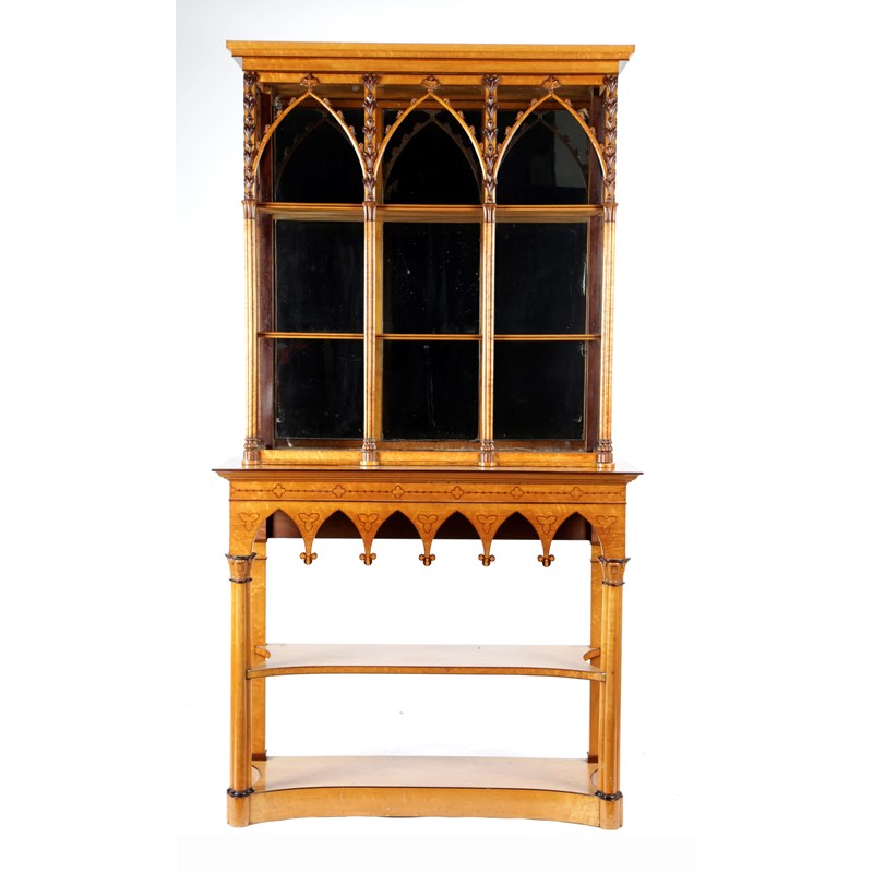 the glazed top with lancet astragals and cluster columns with a mirrored back and two shelves, the open base decorated with trefoils and pendants, with indistinct chalk inscription to the back