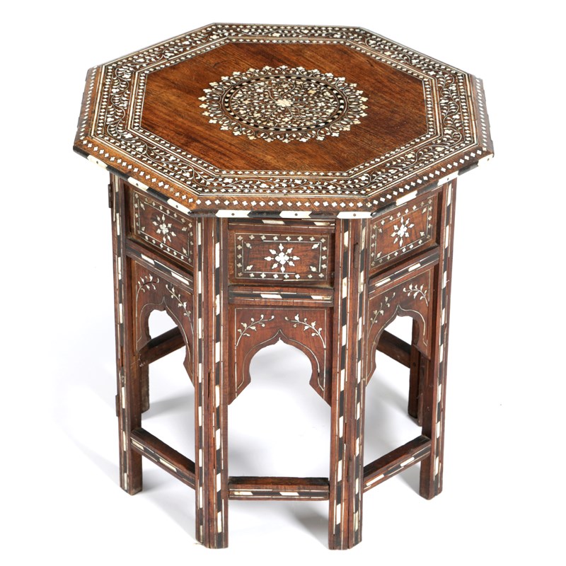 inlaid with bone, ivory and ebony, with scrolling leaves and flowers and chevron borders, the octagonal top now fixed
