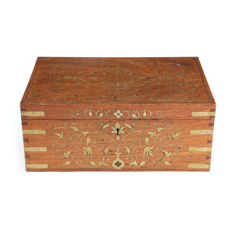 AN ANGLO-INDIAN HARDWOOD AND BRASS MARQUETRY BOX