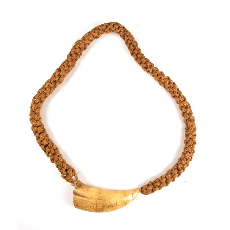 A Fiji sperm whale tooth, inscribed Takeaiw, 6in (15cm) long, with a woven coire cord.