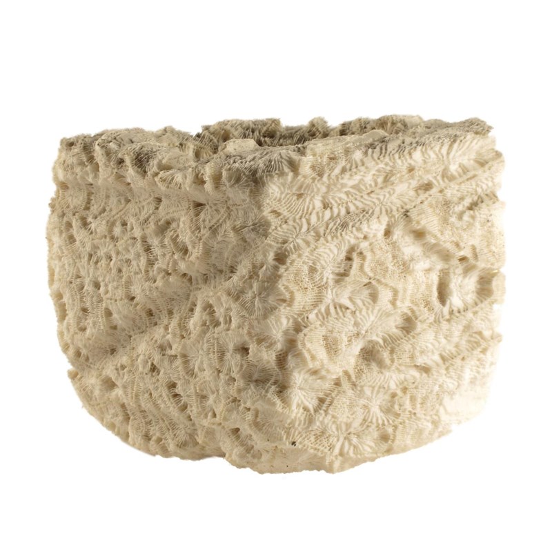 A carved coral square vessel, possibly Cook Islands, with typed label 'Presented by Dr. L.R.Lempriere,' 5¼in (13.2cm) high, 6in (15cm) square.